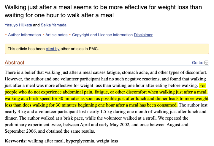 식사 바로 직후 운동을 하면 피로감, 위에 부담 등의 부정적 영향을 준다고 일반적으로 알려져 있는 반면 이러한 식사 직후 운동이--약간 빠른 속도로 30분간 하는-- 체중감량에 효과적이라는 연구 결과를 찾았다.